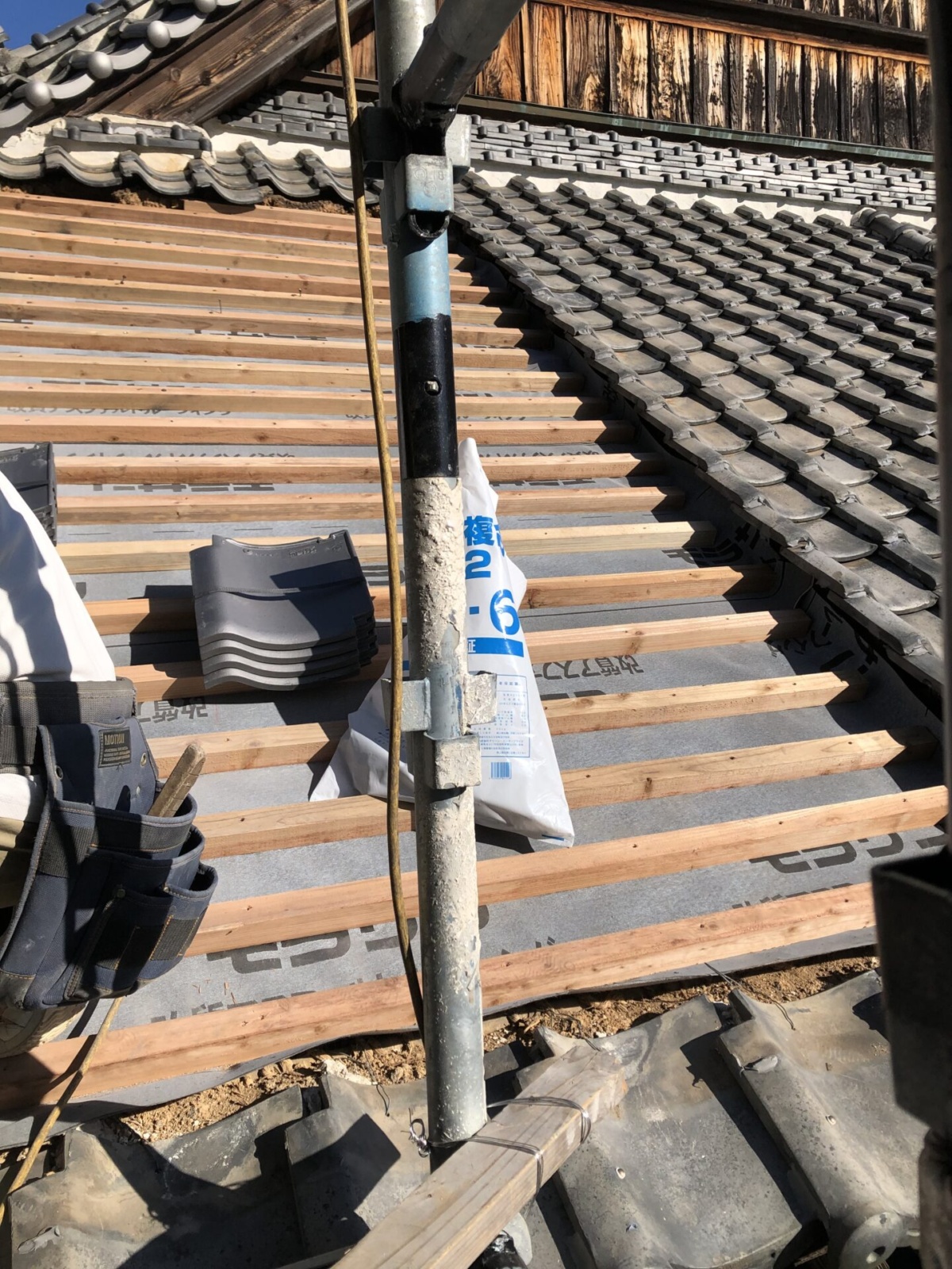 新たに、改質アスファルトルーフィング張り、桟木打ち施工
